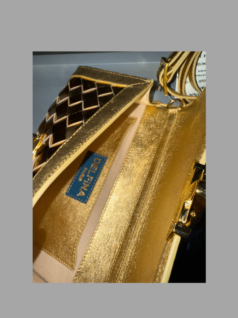 Notre sac baguette Doré et marron tissé à la main dans notre atelier en Inde se porte à la main ou en bandoulière.
